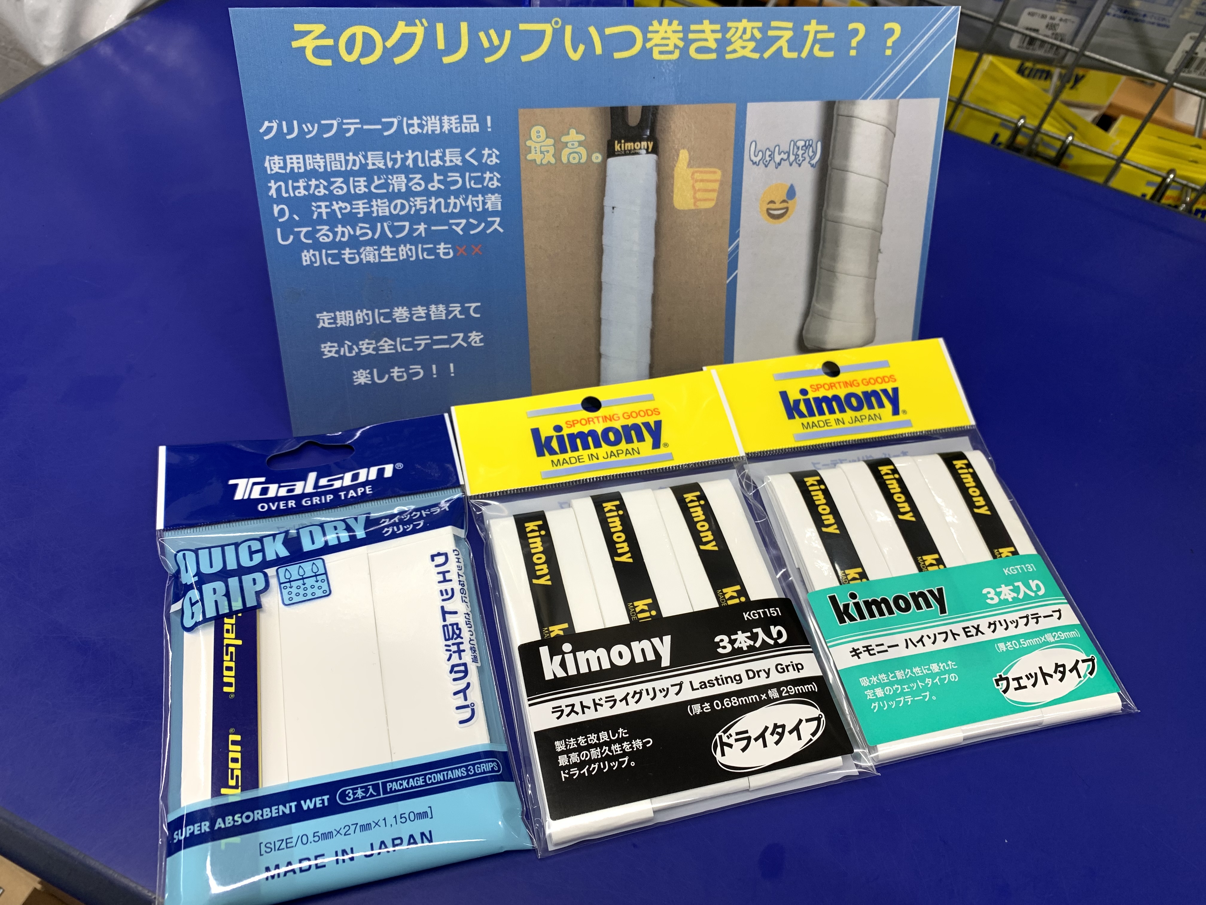 まずはラケットのご購入でお話をしていくのですが、必要なものとして必ずグリップテープのお話になります。