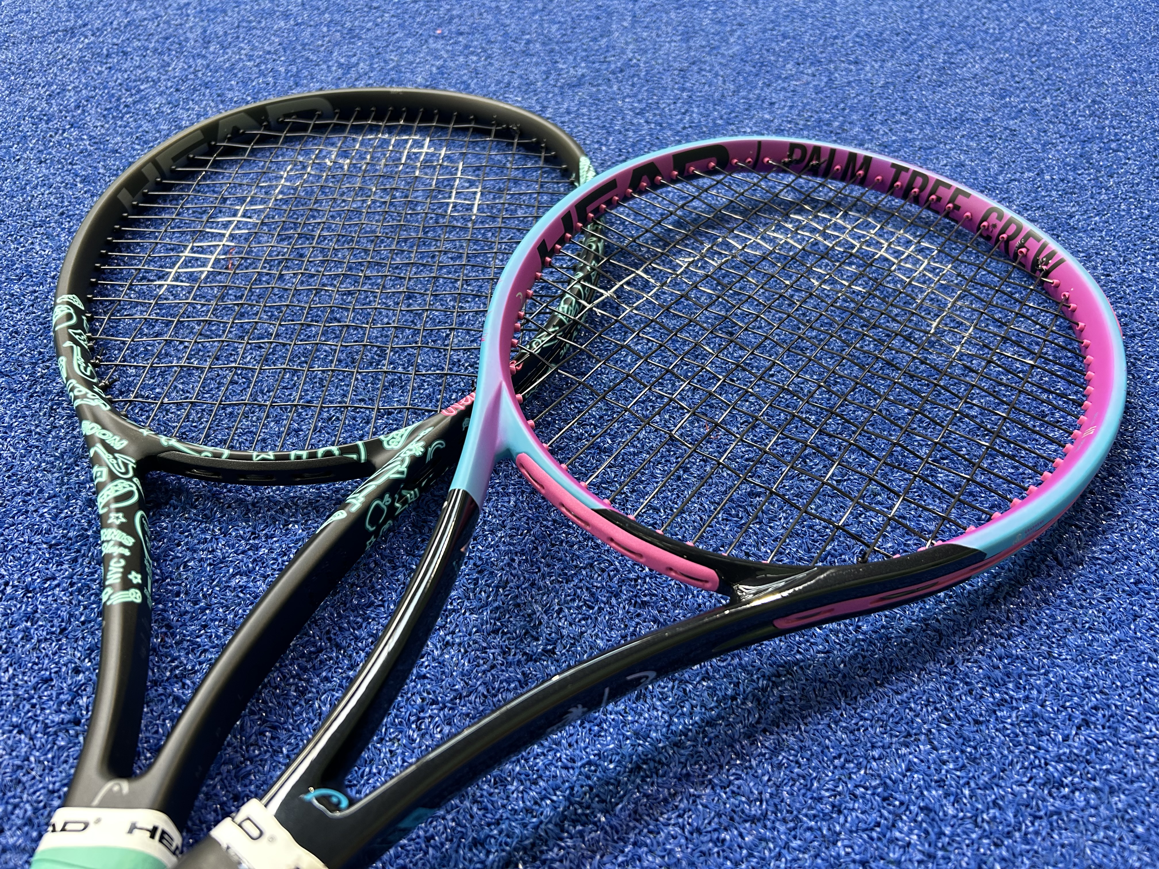 撮影の際に先日発売開始になった限定のPALM TREE CREW、NEONのラケットを持ってきてくれました!